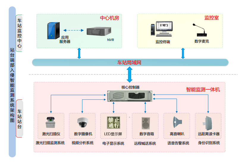站台端部防侵入系统采用红外激光扫描仪、RFID射频识别以及智能分析等功能相结合的智能化技术,对站台端部禁止通行区域进行防护,发现有人员进入该区域时,报警系统自动对现场进行语音警告,同时将报警信息自动推送到车站对讲系统,及时反馈给现场工作人员,实现实时报警和第一时间现场处置。当有工作人员进入警戒区域时,系统可自动开启工作人员模式,避免误报警,从而为车站安全给予智能化保障。